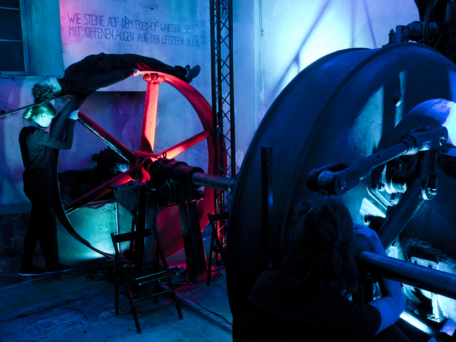 Selbst wenn beide Performances ganz unterschiedlich angelegt waren – Pronegg lässt seine Darsteller/innen noch sprechen, singen, agieren – bei Rainalter sind sie bereits schockgefroren, ein Letzter mit überlebensgroßem Gesicht hampelt sich gerade noch selbst zu Fall – so bewegten und berührten sie beide durch ihre konsequente Linie (um das Wort Dramaturgie zu vermeiden), die ernsthafte Reflexion und eine geradezu berückende Poesie, die nicht zuletzt auch vom Spielort selbst ausging. Denn während Pronegg die nach wie vor eindrückliche Wucht des stillgelegten Kraftwerks wunderbar als Metapher für das Ende einer selbstbestimmten menschlichen Arbeitsteilung nutzen konnte, hatte Rainalter den schwarzen Raum des FTI mit großartigem architektonischen Gespür quasi neu als Theaterort erfunden. Abgehängte Stäbe und verschiedene Podeste in der Mitte des Raumes markierten dabei das Spielfeld, für die Zuschauer gab es Sitzgelegenheiten an den Rändern.