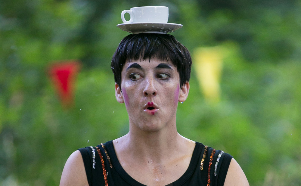 Eine Clownfrau die viel kann, aber nicht muss zaubert aus ihren Taschen und Koffern eine Zirkusgeschichte. Die Bühne wird zur Manege. Auf einer vielzahl alter Töpfe spielt sie kleine Grotesken, passieren ganz unerwartet wilde akrobatische Nummern, trommelt und klopft sie die unterschiedlichsten Rhythmen die sich mit dem Applaus des Puplikums vermischen und sie zu immer weitern wilden Verrenkungen anfeuern.